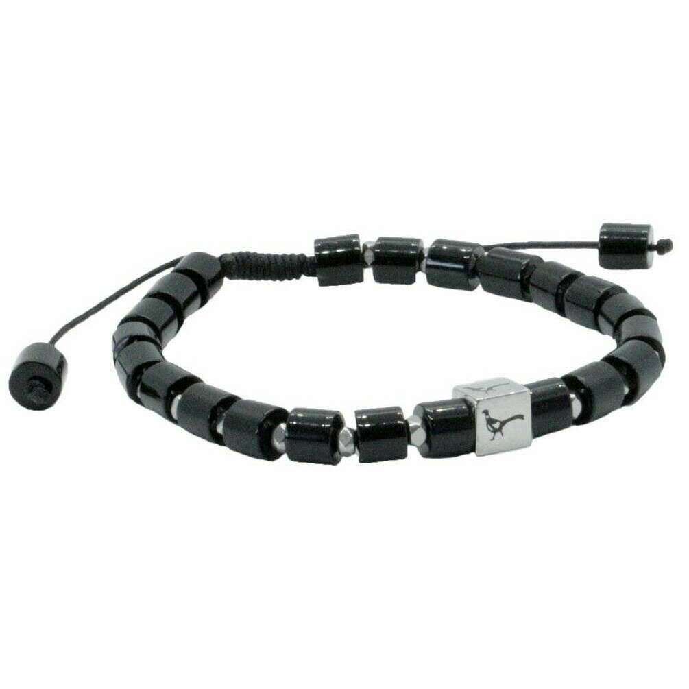 Finished in a David Van Hagen gift bag is the men's pheasant bead agate bracelet that comes in black with silver accents. This bracelet is fully adjustable at the back to fit all gentleman's wrist or to have a customised fit whether that is tight or loose. This beaded bracelet is an ideal accessory for any man looking to add a personalised and contemporary look to his attire with the centrepiece pheasant detailing.